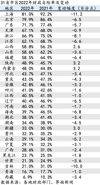 从省份数据看,地方财政自给率下降幅度多在1-4个百分点,抗疫支出增加、大规模增值税留抵退税是导致财政自给率下降的主要原因。