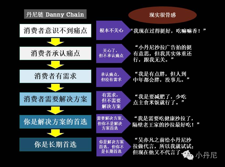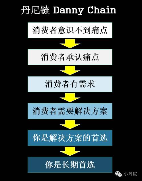 现在你应该知道了“丹尼链”中的第一步:要从“激发用户痛点”入手,让消费者“承认痛点”,接下来我们完整讲一下“丹尼链”。