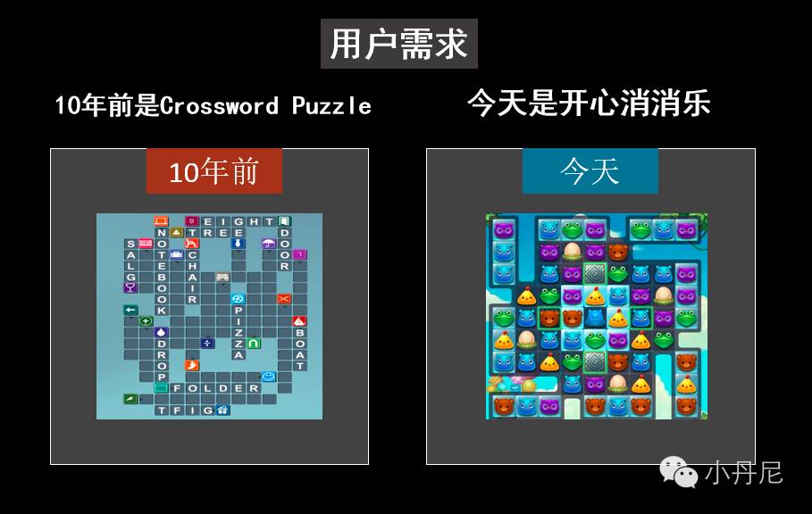 10年前的营销是“Crossword Puzzle”(填字游戏),今天的营销是“开心消消乐”。