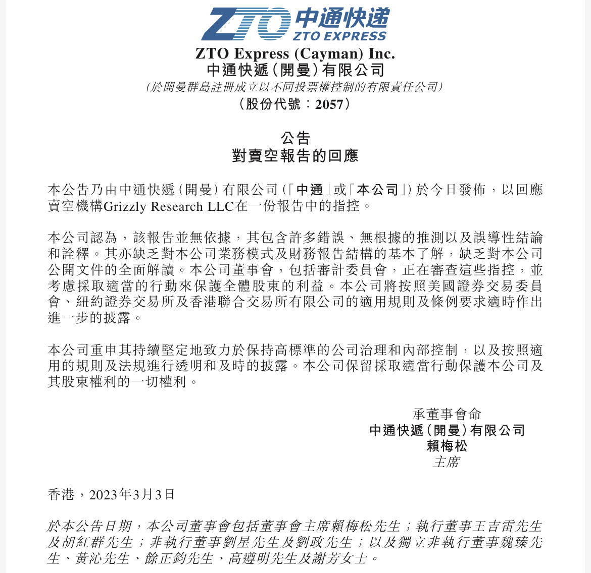 针对此次灰熊的做空报告,中通回应表示,该报告并无依据,包含许多错误、无根据的推测以及误导性结论和诠释,亦缺乏对中通快递业务模式及财务报告结构的基本了解,缺乏对中通快递公开文件的全面解读。中通快递董事会,包括审计委员会,正在审查这些指控,并考虑采取适当的行动来保护全体股东的利益。另外,中通将按照美国证券交易委员会、纽约证券交易所及香港联合交易所有限公司的适用规则及条例要求适时作出进一步的披露。