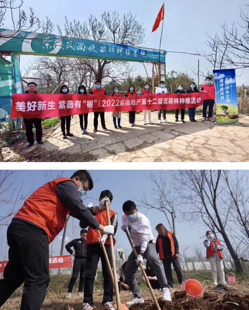 2022年3月12日,“美好新生 紫薇有’树’2022紫薇地产第十二届低碳林种植暨生态环境保护宣传志愿服务”活动,在秦岭北麓洪庆山举行。由紫薇地产党员代表、工会代表、青年志愿者及员工代表等人组成的志愿者队伍,前往紫薇低碳林种植基地栽种新绿。