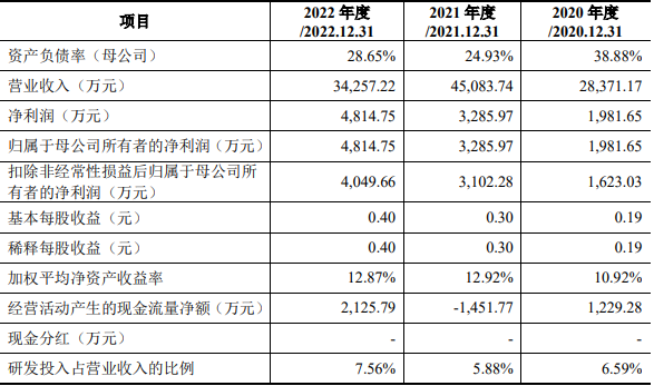 公司是一家专业从事电子封装材料及高性能改性塑料等高分子新材料产品研发、生产、销售的国家级专精特新重点“小巨人”企业。公司于2020年、2021年及2022年分别实现营业收入2.84亿元、4.51亿元、3.43亿元;分别实现归母净利润1981.65万元、3285.97万元及4814.75万元。