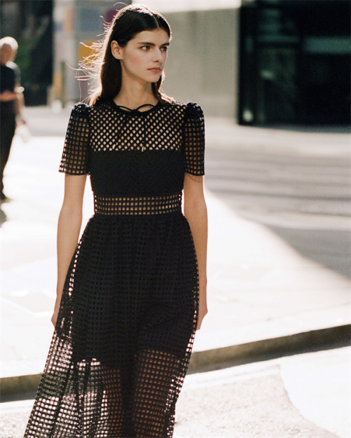 东座L3层self-portrait 2023春夏系列通过不同风格的时尚造型呈现出独立、自由且刚柔并济的当代东方女性形象。黑色网格蕾丝中长连衣裙采用几何魅力的网格蕾丝制成,既性感又永恒;巧妙的泡泡袖、蝴蝶结装饰的领口和中长裙摆,巧妙的衬里增加了额外的尺寸,不妨搭配高跟鞋和亮唇,打造属于你的下一场晚会造型。
