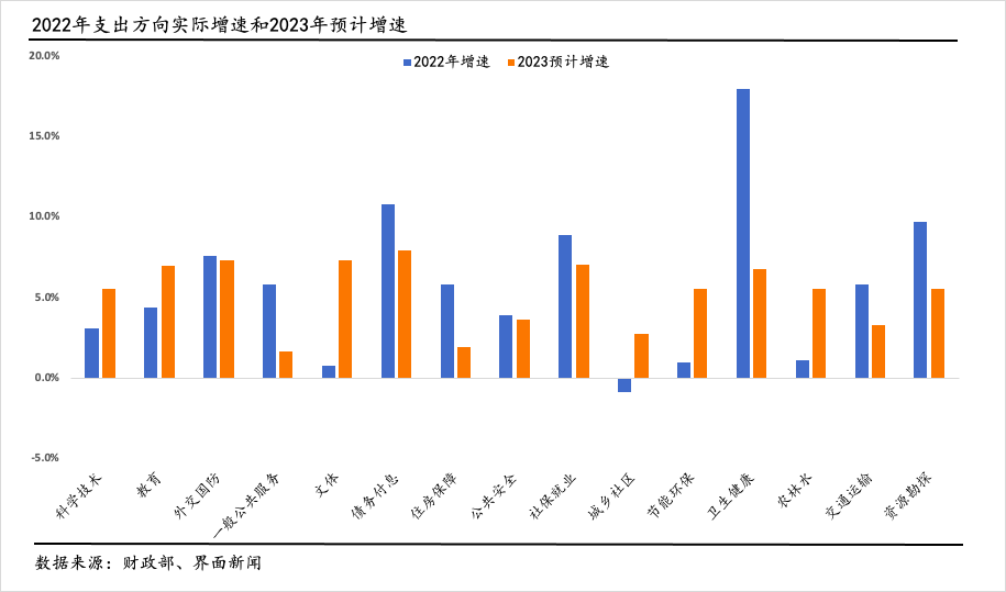 和2022年相比,卫生健康支出增速大幅放缓11.2个百分点,增速预计为6.8%;一般公共服务支出增速放缓4.1个百分点。另一方面,文化旅游体育与传媒、灾害防治及应急管理等其他支出增速加快最多,达到6.6个百分点,预计增速7.3%;节能环保和农林水支出增速也加快4个百分点。