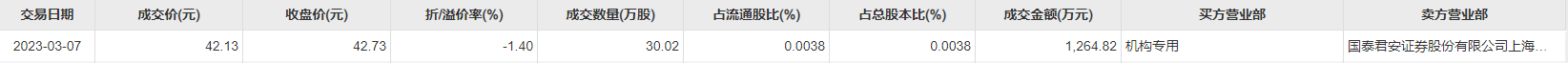 中芯国际3月7日大宗交易成交30.02万股,成交额1264.82万元,占当日总成交额的1.64%,成交价42.13元,较市场收盘价42.73元折价1.4%。
