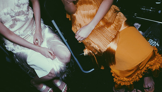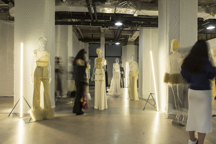 和陈序之一样来自中央圣马丁艺术学院的黄婉冰,在上海时装周展现出年轻设计师少有的繁复工艺。系列灵感来源是比利时先锋导演Olivier Smolders于1990年拍摄的短片《孤独》(《Seuls》),描述的是自闭症儿童。在晚间展示时段,设计师特意将灯光调成忧郁的蓝色,身着白色马毛衣服的模特被“关在”长方形玻璃箱子里,默默玩钢珠,敏感、执着又不失灵性。到了尾声,所有观众可以在玻璃外壳上写下话语,或以涂鸦与玻璃盒中的女孩对话。