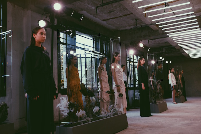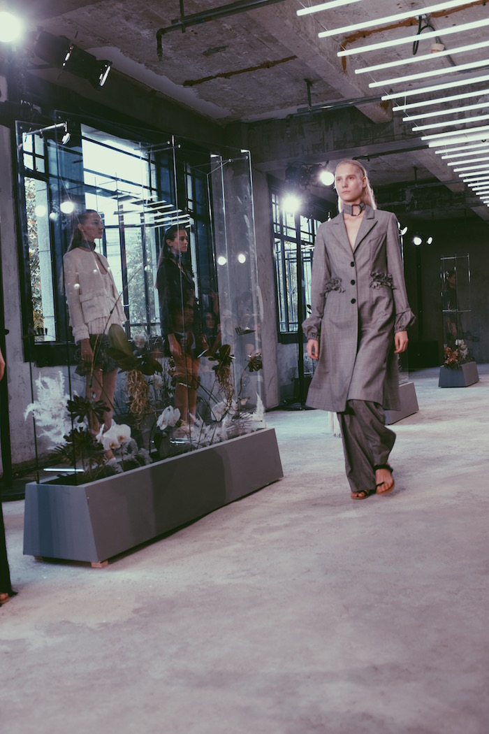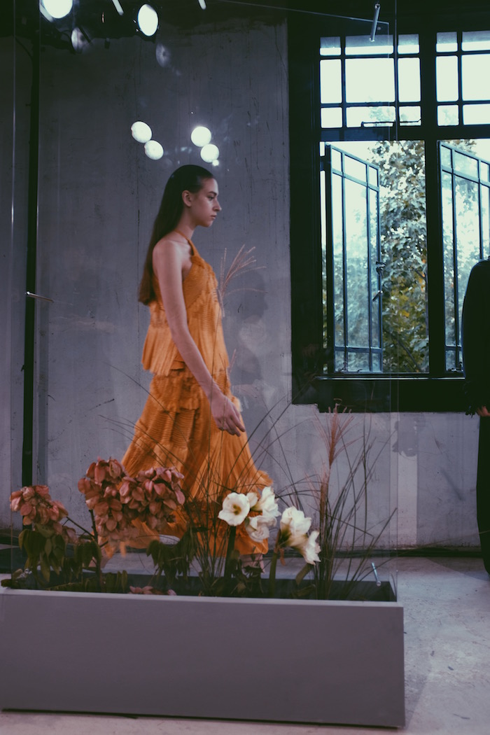 和9月伦敦时装周静态展不同,陈序之的上海展示更像是小型走秀。原本作为布景的绿野花丛有了更为精致的颜色配搭与错落呈现,它们被安置在若干巨型玻璃框架中,顺势演变为模特来回走道的天然间隔。