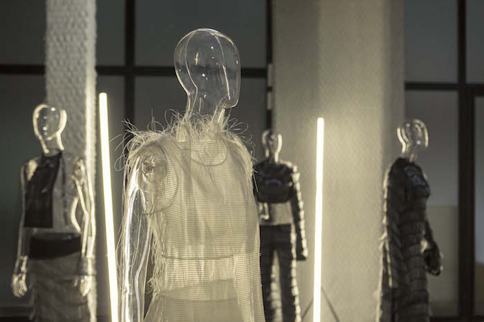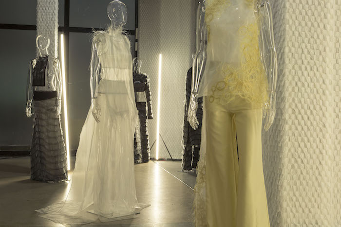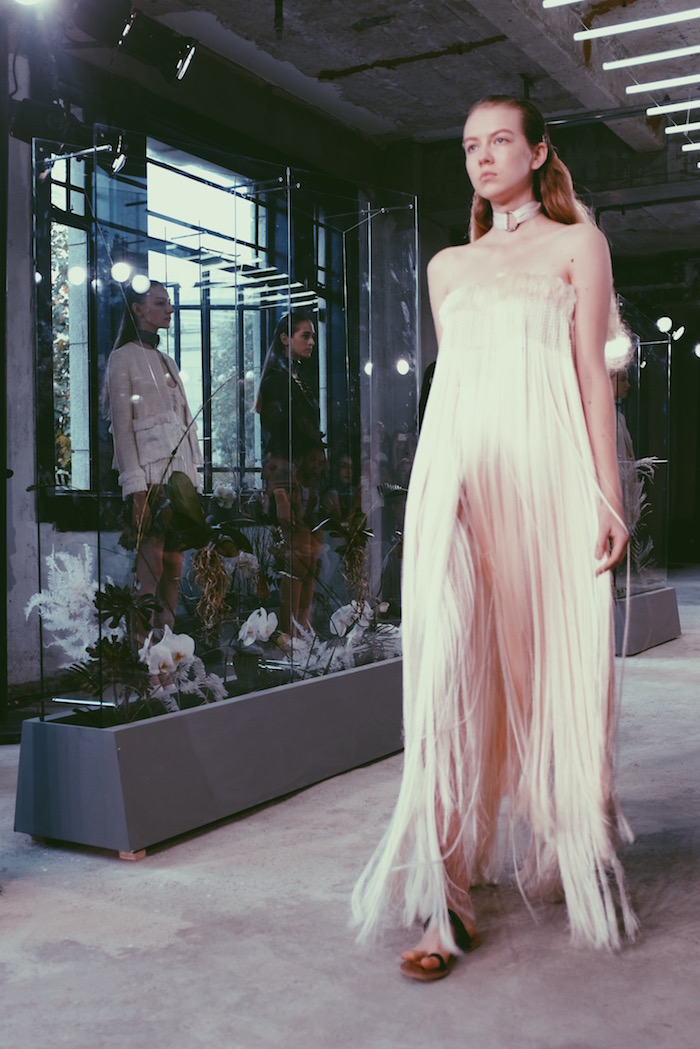 或许她的衣服更像是艺术作品,就连空间墙面也被照顾到——设计师白色流苏编织面料覆盖廊柱。可以想象若是一阵强风吹过,整面墙会呈现出怎样的流动感。