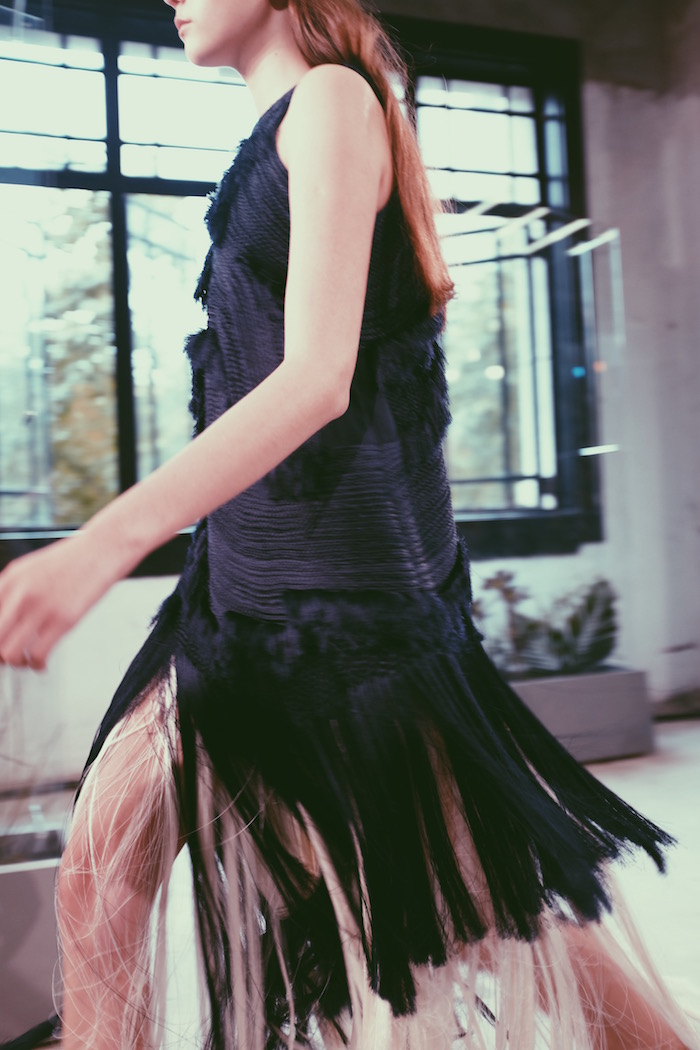通常用作时装点缀的马尾毛在她手中变成主要面料,它们被设计师以编织、立体刺绣、创新环装蕾丝工艺等手法呈现出特有质感。例如她将一簇簇马毛环绕卷曲后通过刺绣固定在两层透明面料之间;又譬如她把透明马毛编织进面料后层层铺叠创造出银河一样的流光质感。