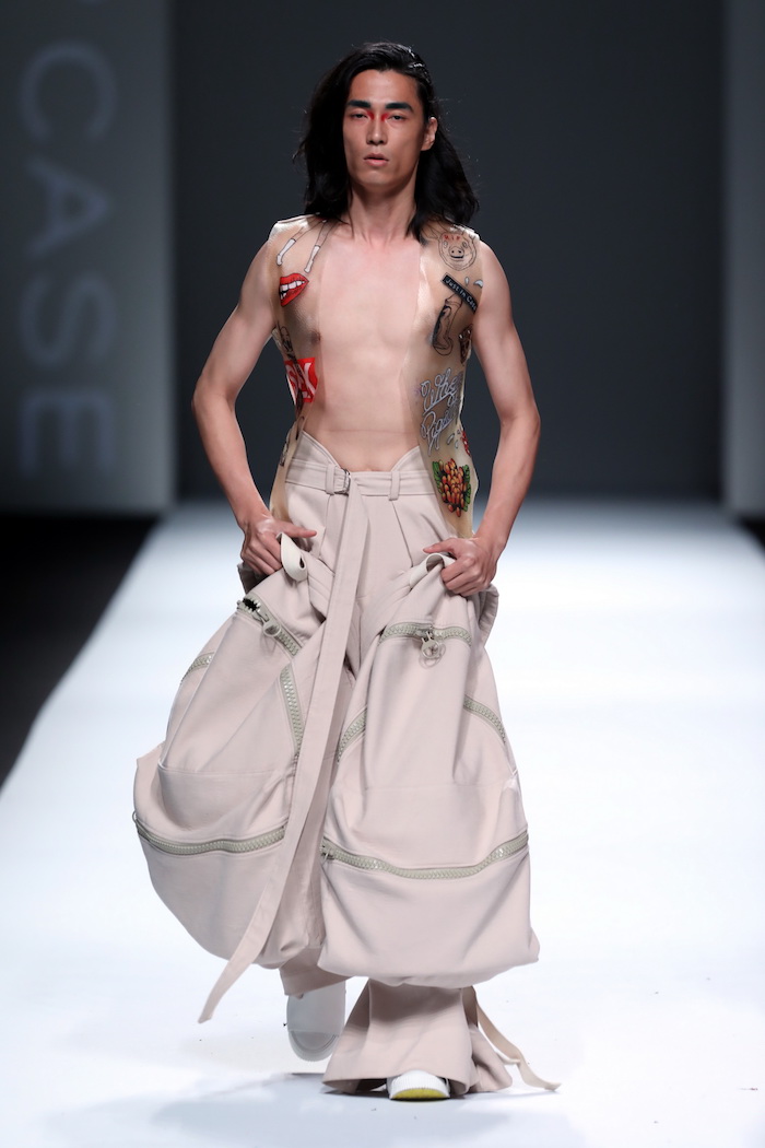 Just In Case走完秀后,品牌设计师周裕颖接受了界面的采访:“你看,这是用猪皮做的,上面还有很多细微的毛孔。”接着周裕颖又从黑色的大包里拿出了一件半透明的衣服,两块猪皮的边缘用松紧带连接了起来,做成一件马甲的样子,“这上面的图案都是用刺青做的,其中有些是比较色情的图案,想要表达猪八戒比较色比较花心的形象。”而底下用来搭配马甲的裤子更让人记忆犹新,一条及地的阔腿裤上有两个浑圆的与肤色相近的大书包,有些令人脑洞大开,设计师说:“这是猪八戒的身体。”