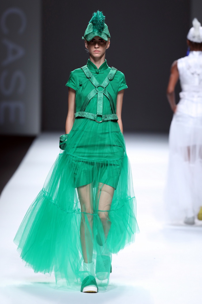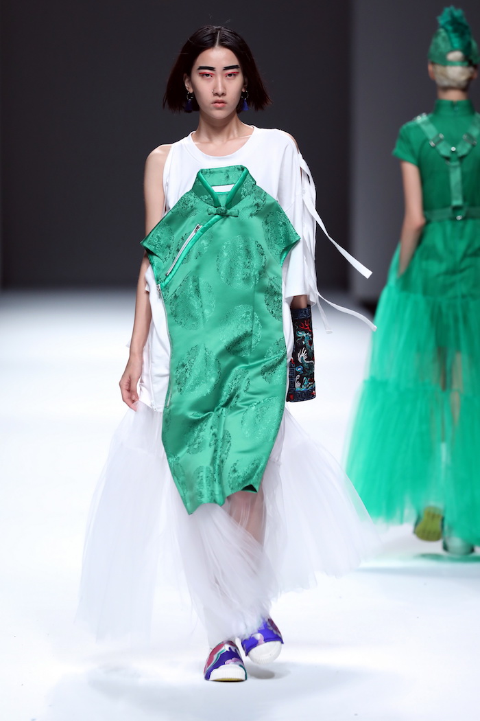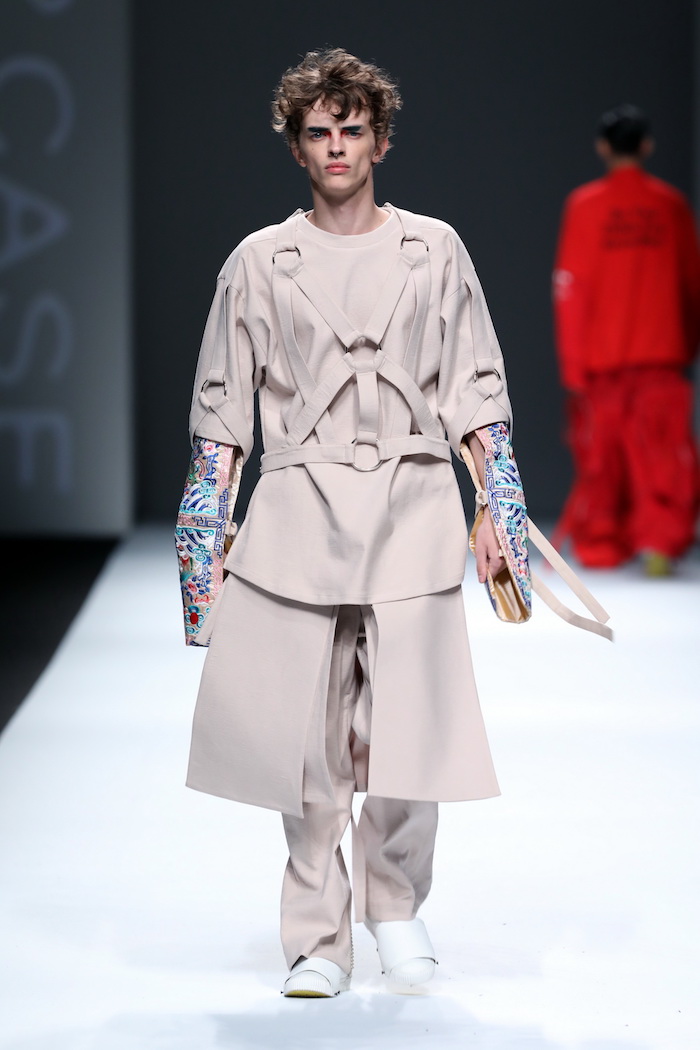 不过,纵观整场秀的38个造型,说不上非常的连贯,部分设计也很难让人觉得它们来自同一个系列,彼此有些割裂。Just in Case想在一个秀中使用的元素太多了,以传统的中国元素为主轴,大量使用了旗袍盘扣、百龙织锦缎、云形如意图腾等精致传统服饰手工绣花元素,又搭配上绷带束缚结构与铆钉、别针等街头庞克服装细节。