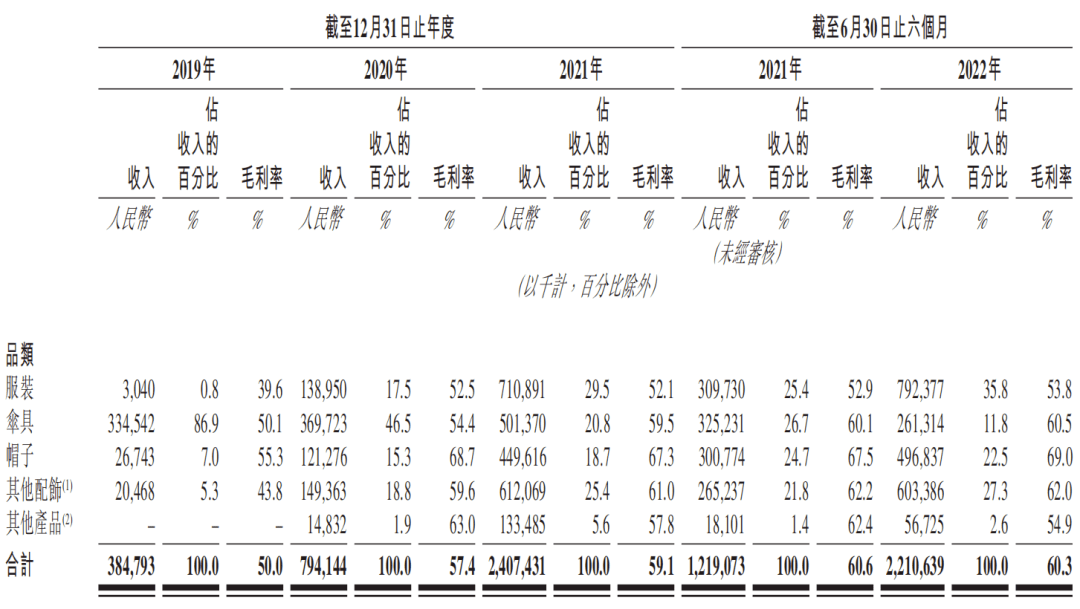 招股书数据显示,蕉下的产品结构中,三大细分类别产品为服装、伞具和帽子,2021年的营收占比分别是29.5%、20.8%和18.7%,服装的占比最高。