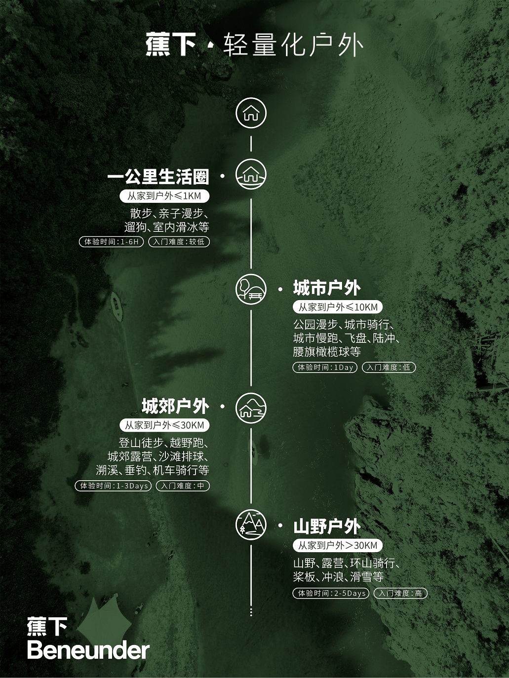 2022年,蕉下首次提出了轻量化户外的概念,按照“从家到户外的运动半径”,结合不同季节特性的场景活动,将轻量化户外划分为1公里生活圈、城市户外、城郊户外、山野户外四大场景。