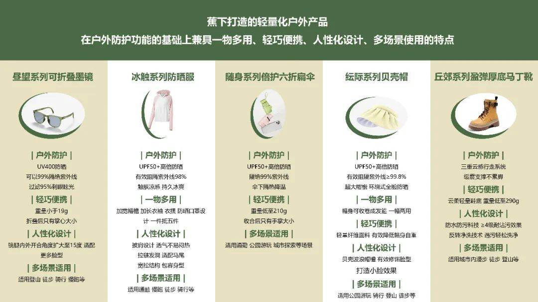 从防晒切入户外市场,蕉下围绕户外场景建立产品矩阵,逐步完善轻量化户外的全版图。