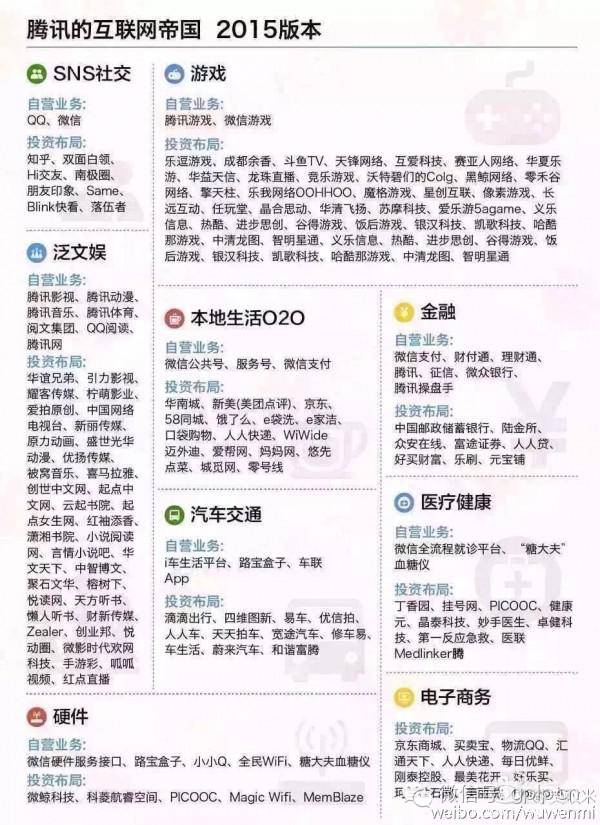 由上图可见,以社交软件微信和QQ为基础,腾讯在游戏、泛娱乐、本地生活、出行、游戏、医疗健康、金融、电子商务、硬件等领域都展开了布局。