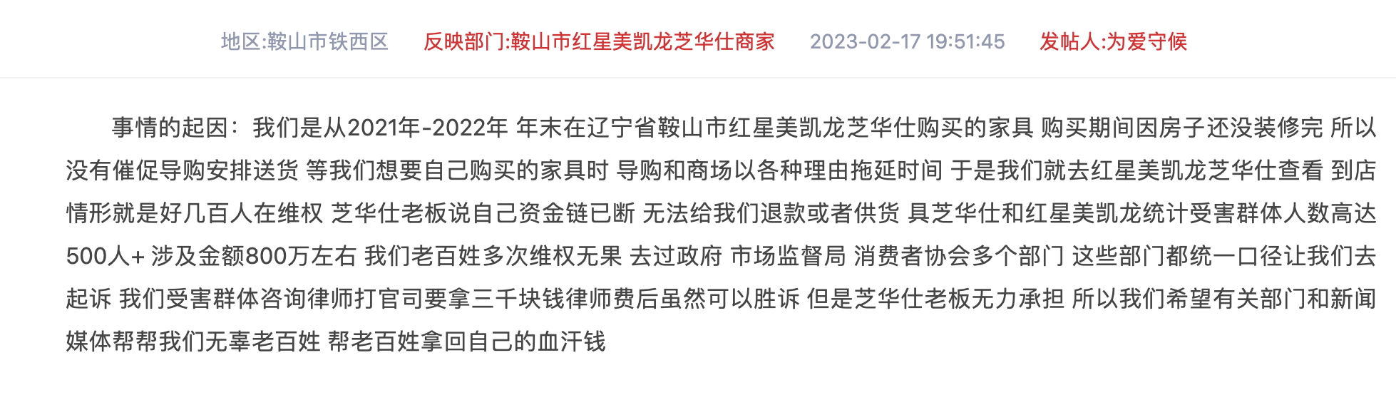 今年2月中旬,网友“为爱守候”在辽宁广播电视集团的投诉平台上称,自己和多位消费和在2021-2022年期间在鞍山红星美凯龙芝华仕购买了家具,期间由于房屋装修没有催促品牌发货,但在今年得知芝华仕负责地区销售的负责人出现资金链断裂,无法退款或供货的情况。