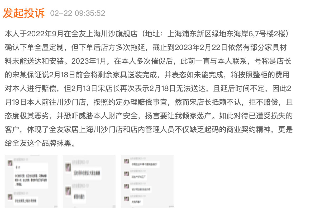 有网友在黑猫投诉上称,自己2022年9月在全友家居上海川沙旗舰店下单了价值3.5万元的全屋定制家居,但直到2023年2月下旬仍有部分家具材料未能送达和安装。