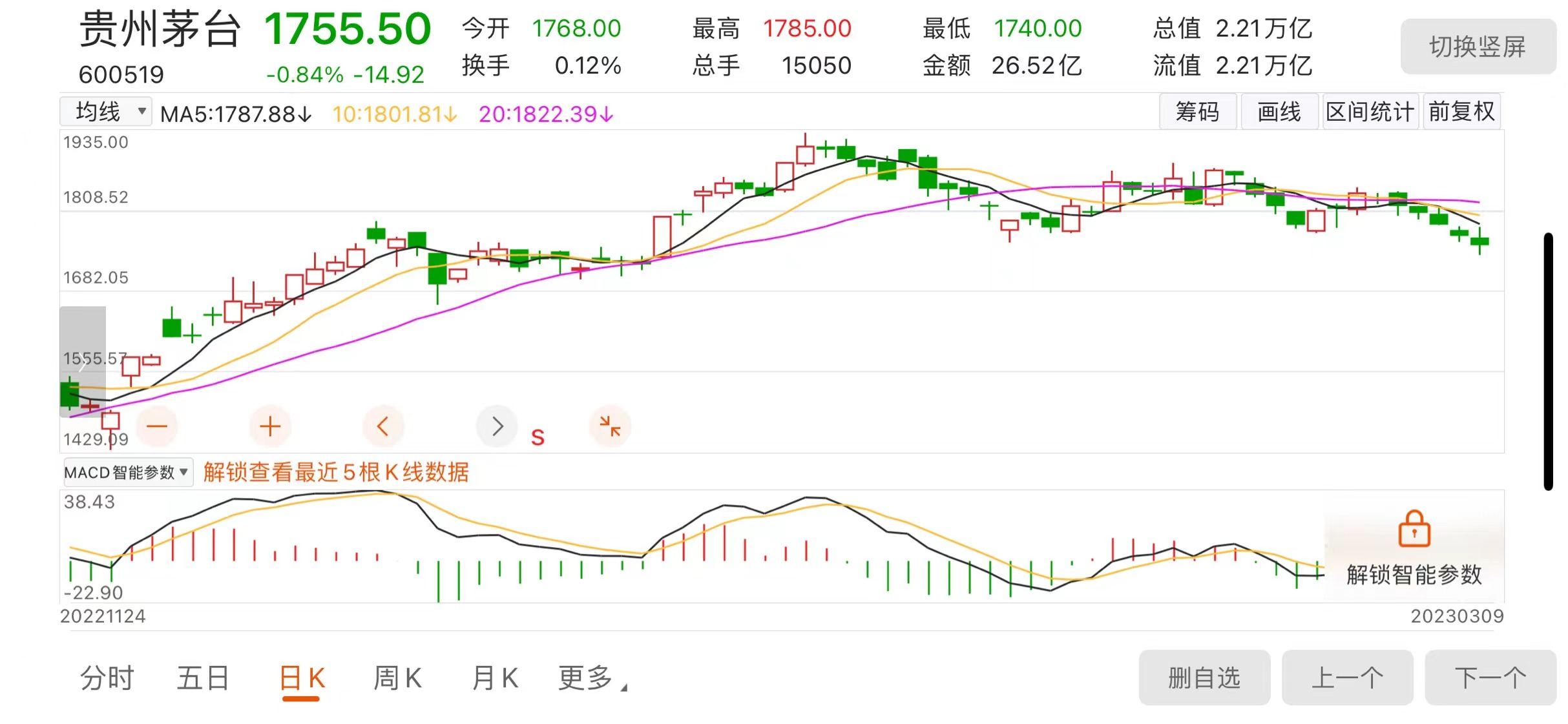 值得注意的是,作为白酒风向标的贵州茅台自3月2日至今连续6个交易日呈现不同程度的下跌,并跌破1800元/股大关。界面新闻整理资料发现,3月2日贵州茅台以1828元/股,涨幅-0.57%收盘,经过六个交易日后,3月9日收盘成交价达1770.02元/股。经粗略计算,贵州茅台股价6个交易日内股价下跌3.17%。