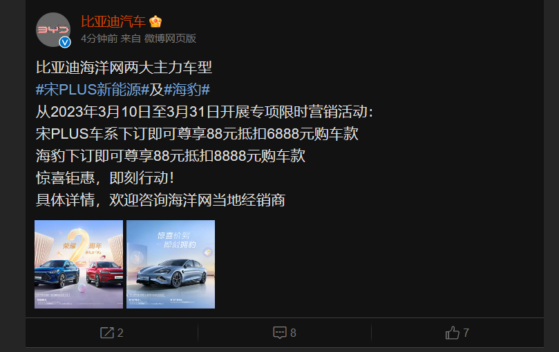 据比亚迪汽车微博3月9日消息,比亚迪海洋网两大主力车型从2023年3月10日至3月31日开展专项限时营销活动:宋PLUS车系下订即可享88元抵扣6888元购车款;海豹下订即可享88元抵扣8888元购车款。