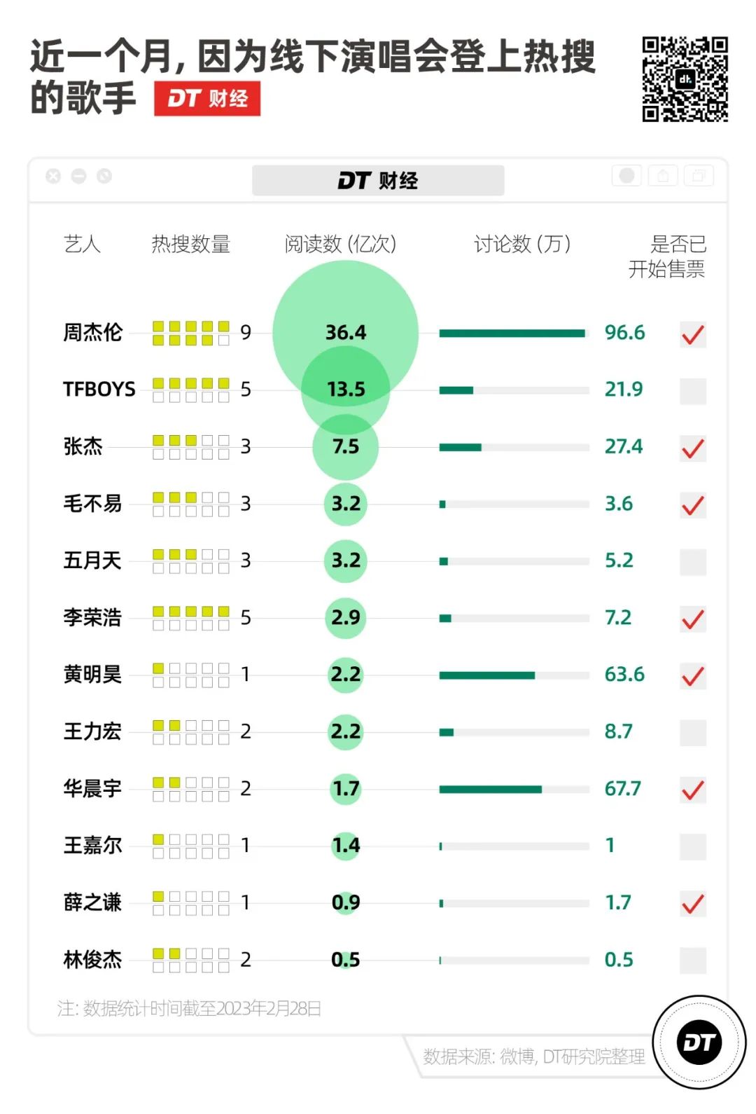 周杰伦最受期待,上的热搜也最多。2月23日,周杰伦官宣演唱会海口站,当晚就登上热搜;两天后,票还没抢到,“演唱会附近酒店涨价三倍”也上了热搜。