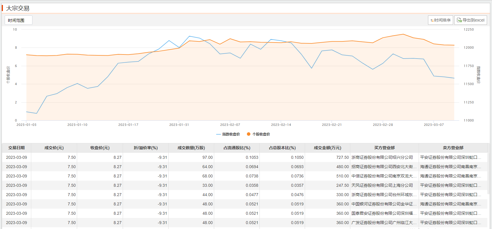 章源钨业3月9日大宗交易成交450万股,成交额3375万元,占当日总成交额的26.83%,成交价7.5元,较市场收盘价8.27元折价9.31%。