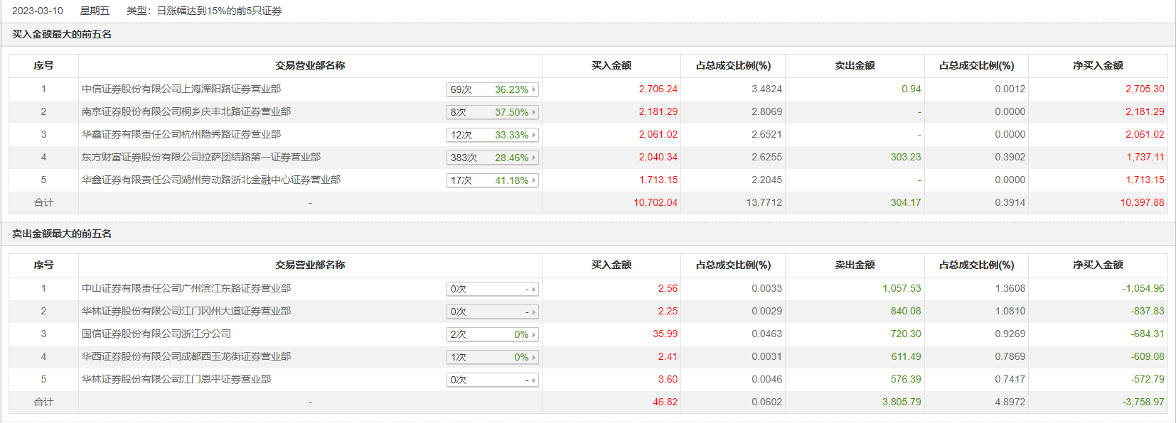 3月10日,恒锋信息今日涨停,龙虎榜数据显示,上榜营业部席位全天成交1.49亿元,占当日总成交金额比例为19.12%。其中,买入金额为1.07亿元,卖出金额为4109.96万元,合计净买入6638.91万元。