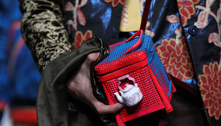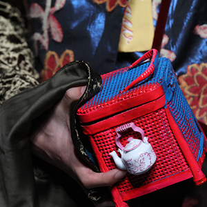 在英国留学七年的设计师韩雯,带有“西学东渐”的色彩。在款式的设计上,我们没有看见中国风一贯的标配——旗袍、长衫。相反的,她融合了时下的趋势,袖子加长、不对称领子、漆皮袖套、丝绒背心裙、百褶裙、刺绣夹克等等。