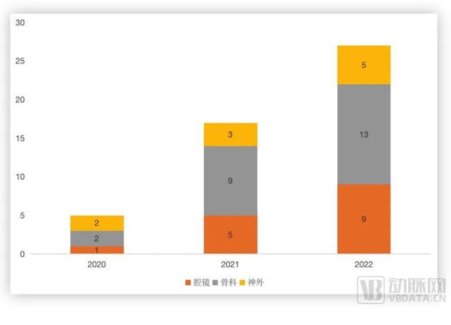 一款产品从概念到定型,从研发到审批,大概需要5年左右的一个周期。最近几年陆续有产品获批,但每年仅有数款,到了2022年,手术机器人产品呈现出大爆发状态。据不完全统计,2022年全年共有15款产品获批,其中腔镜三款,骨科10款获批,神经外科两款。