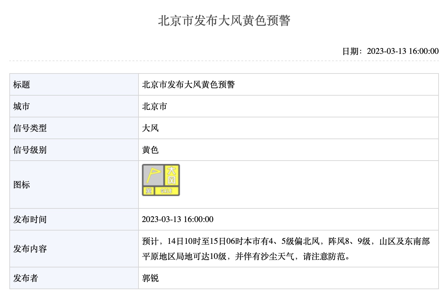 据北京市气象局网站消息,北京市2023年3月13日16时发布大风黄色预警,预计,14日10时至15日06时本市有4、5级偏北风,阵风8、9级,山区及东南部平原地区局地可达10级,并伴有沙尘天气,请注意防范。