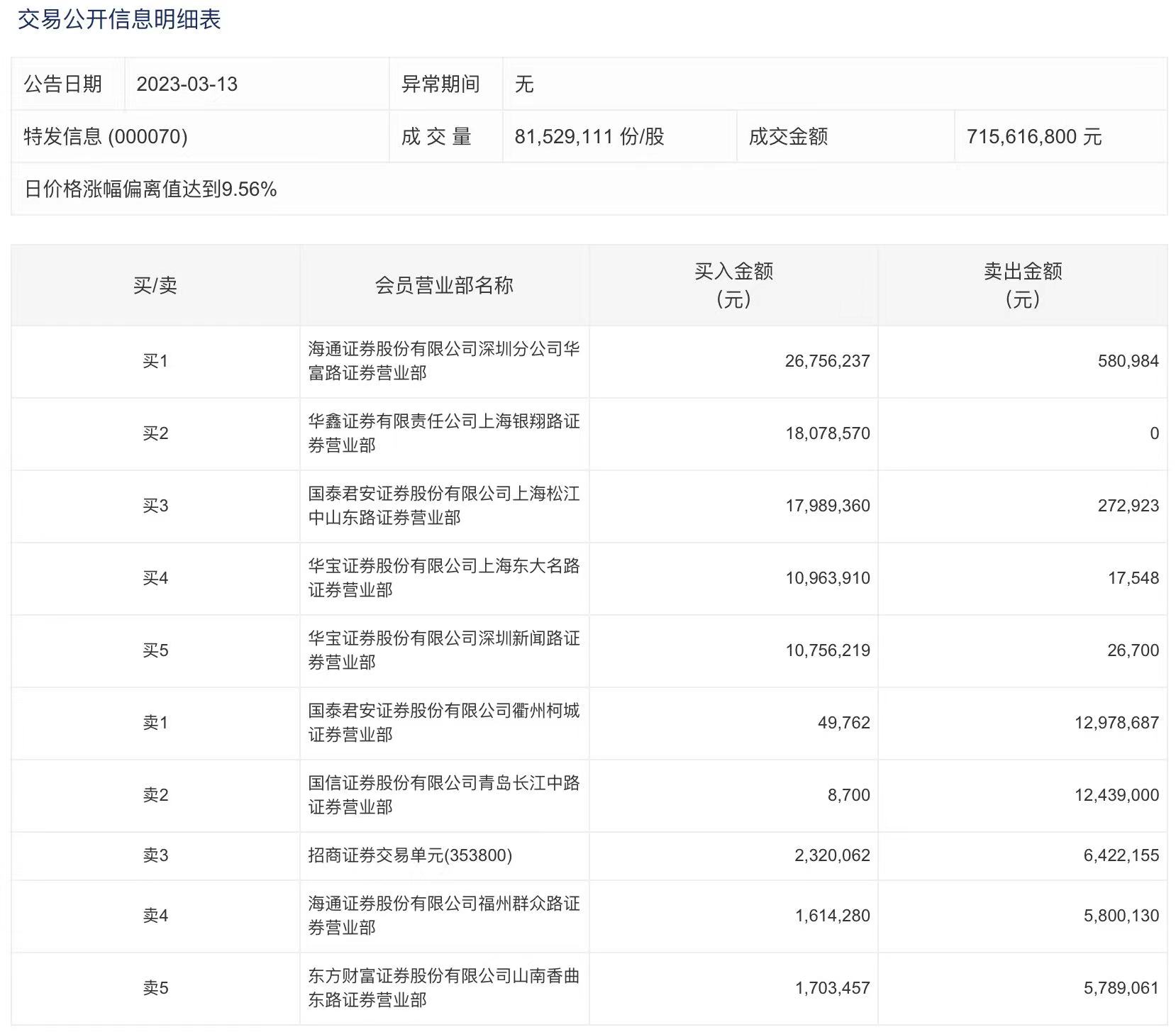 3月13日,特发信息今日涨停,龙虎榜数据显示,上榜营业部席位全天成交1.35亿元,占当日总成交金额比例为18.8%。其中,买入金额为9024.06万元,卖出金额为4432.72万元,合计净买入4591.34万元。