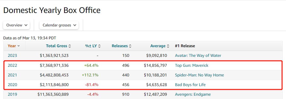 受新冠疫情冲击,北美电影市场近几年并不好过。2020年和2021年全年票房皆无法突破50亿美元,创下21世纪北美年度票房的历史新低记录,全球第一大电影市场的宝座被拱手让给中国内地。