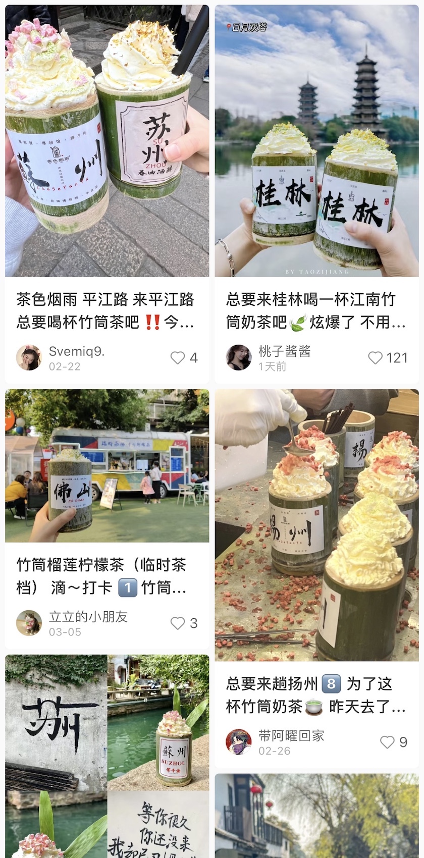 北京南锣鼓巷700米的街上目前散布着超12家竹筒奶茶店,每家店门口都码着3排以上的竹筒墙;广东潮州、汕头等地已出现竹筒奶茶的姐妹版本“竹篓奶茶”,有的还装上LED灯泡方便人们在夜晚与背后的景点合影;竹筒奶茶甚至成为城市旅游的打卡文案模板,社交平台上铺天盖地的“总要为了这杯竹筒奶茶来趟XX吧!”,城市名可以直接替换为苏州、杭州、宁波、厦门等。