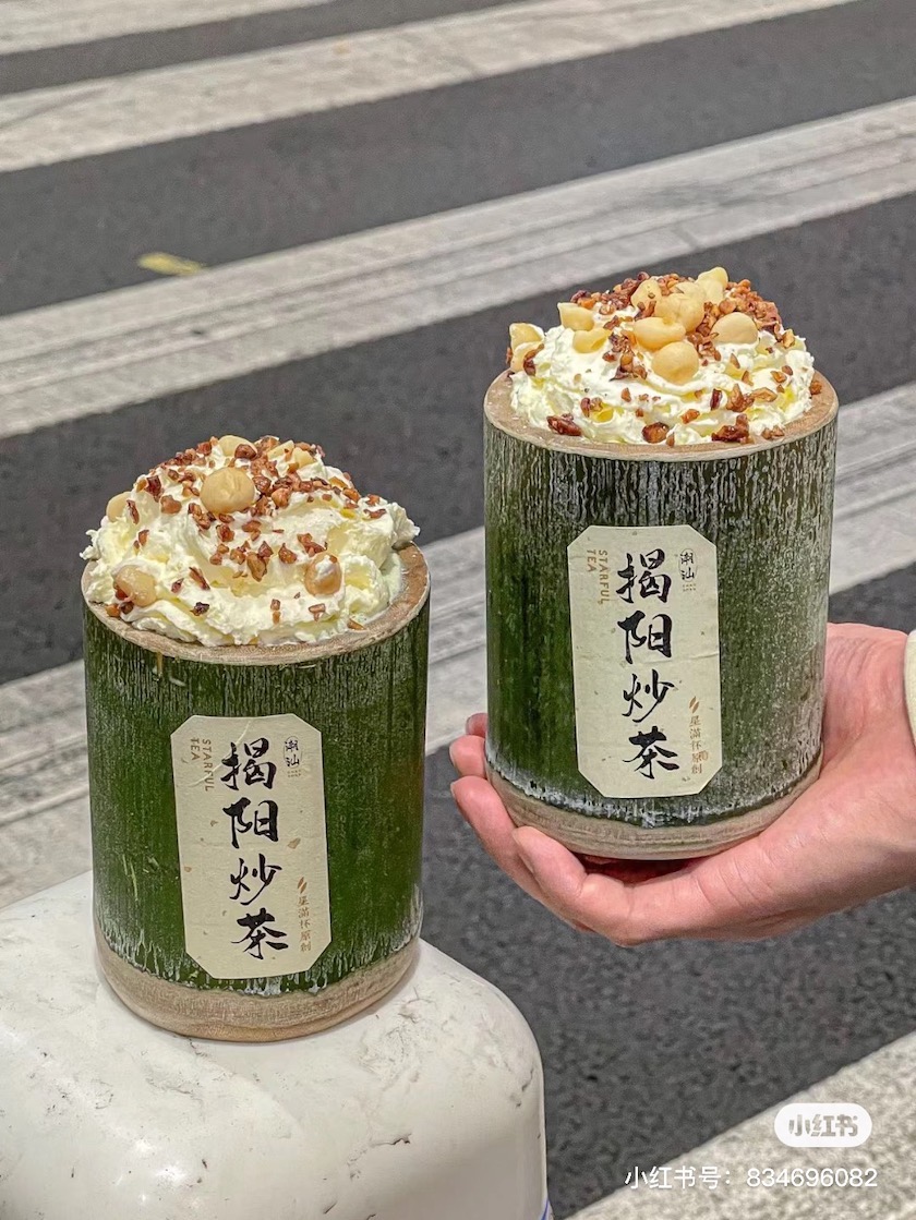 清洗干净的竹筒用作杯子,奶茶、咖啡、水果茶作为基底,几大圈奶油顶搭配着水果冻干是竹筒奶茶的统一公式,当然最重要的是要在竹筒表面贴上南京、上海、苏州等城市名标签。南至广州、深圳,北到沈阳、哈尔滨,全国各地的消费者都爱上打卡竹筒奶茶。