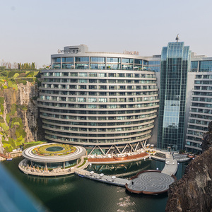 上海佘山世茂洲际酒店又名世茂深坑洲际酒店,是世茂集团历经12年、耗资20亿元,依附深坑崖壁建造而成的。酒店下探地表88米,被美国国家地理频道《世界伟大工程巡礼》评为“世界十大建筑奇迹”酒店。