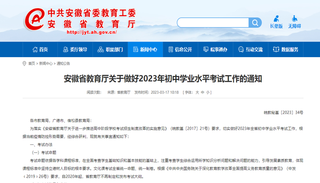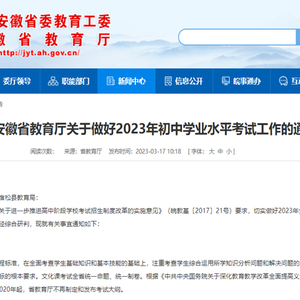 3月17日,安徽省教育厅官网发布《安徽省教育厅关于做好2023年初中学业水平考试工作的通知》。