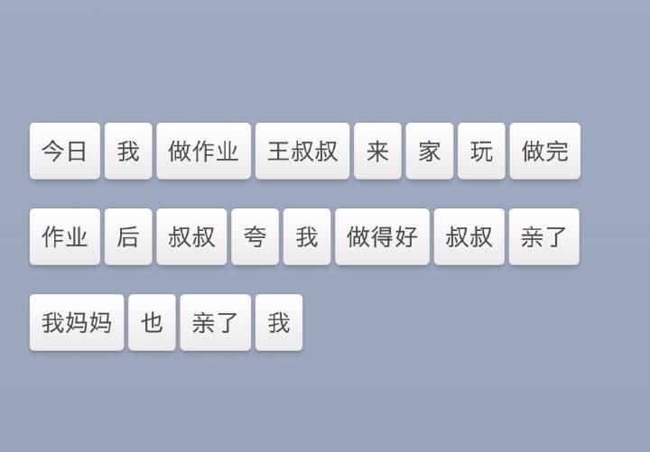 今日我做作业王叔叔来家玩做完作业后叔叔夸我做得好叔叔亲了我妈妈也亲了我。