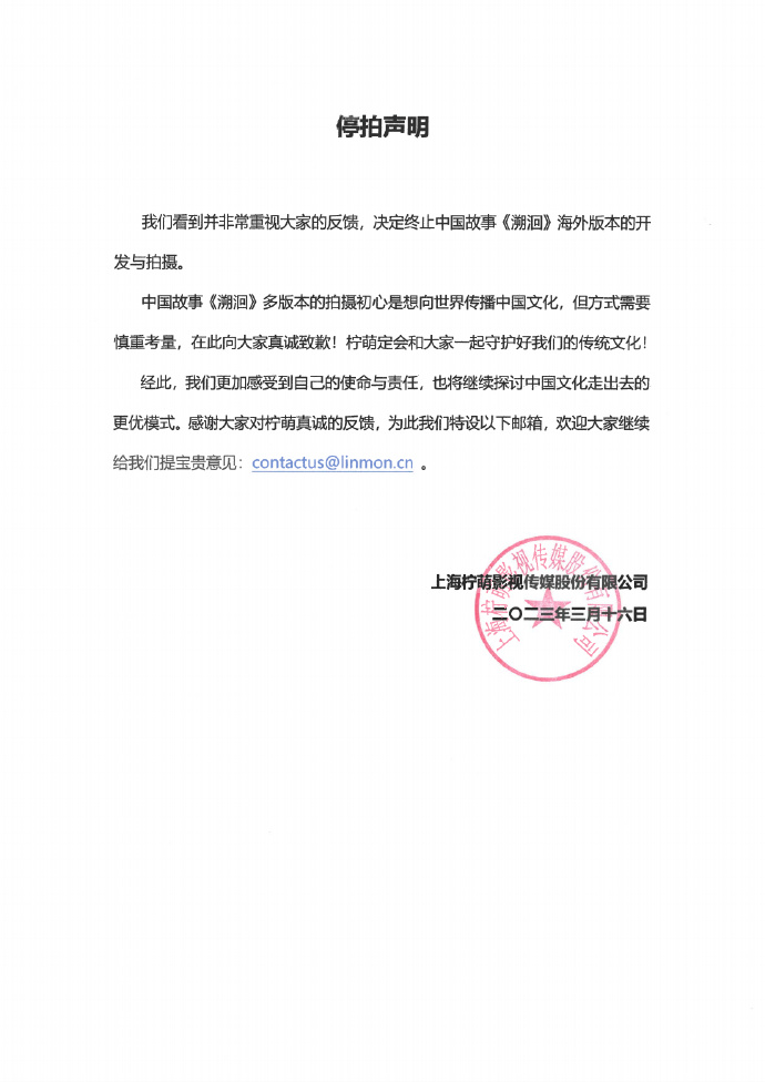 可是,发起抗议的网友显然对柠萌的解释仍然不满意。他们持续发文批评柠萌,坚持要求柠萌与韩方停止合作。3月16日晚上,柠萌发布停拍声明,宣布终止《溯洄》海外版本的开发与拍摄。