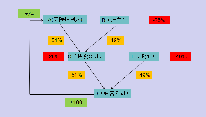 我们现在来解析上面这张最简单的金字塔结构图:实际控制权人A通过持有持股公司C公司51%的股权,然后再让C公司持有实际经营公司D公司51%的股权,最终实现实际控制人A控制D公司的目的。