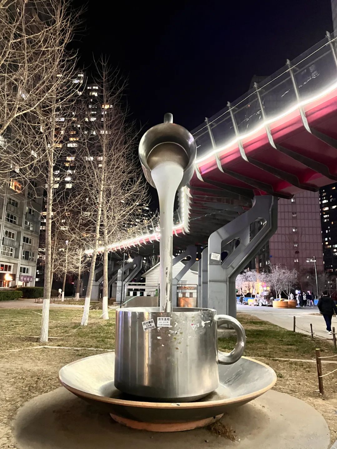 ▲ 一杯正在倾倒的咖啡的雕塑。