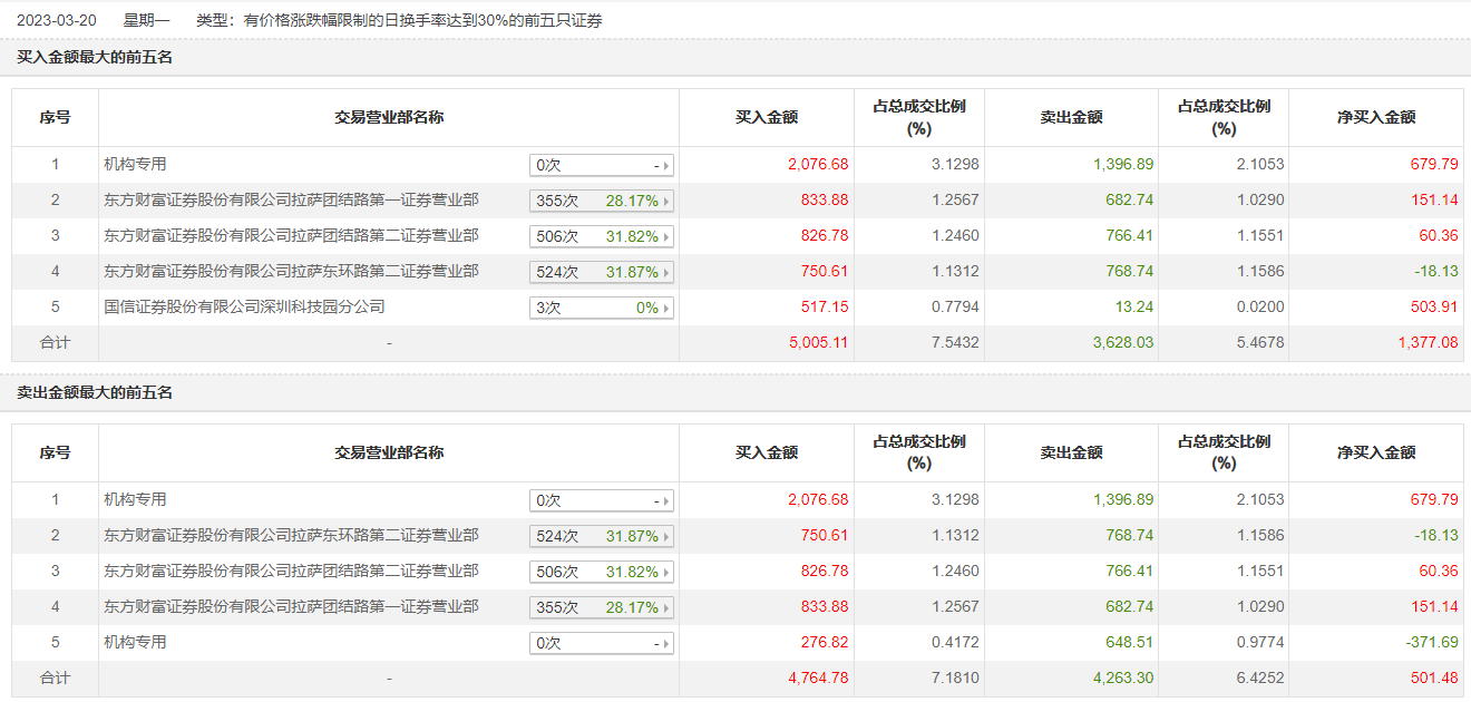 具体来看,机构买入2353.51万元,卖出2045.4万元,合计净买入308.11万元。此外,东方财富证券拉萨东环路第二证券营业部、东方财富证券拉萨团结路第二证券营业部分别卖出768.74万元、766.41万元;东方财富证券拉萨团结路第一证券营业部、东方财富证券拉萨团结路第二证券营业部分别买入833.88万元、826.78万元。