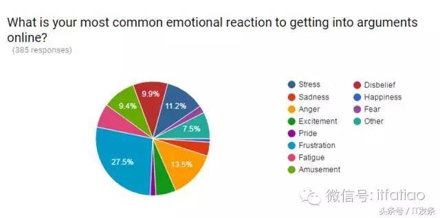 但是,参与这些争论时我们感觉如何?最常见的情绪反应是失望,有27.5%的人声称无奈失落,另有18%的人感到难过,当人们误解了他们的话语的意思时,他们感觉到这一点。“不幸的是文字经常无法描绘的确切消息,思想,幽默或者我们的情绪,”Branley说。“如果没有面部表情和肢体语言来帮助我们的理解,真是太容易被书面文字所误解。”