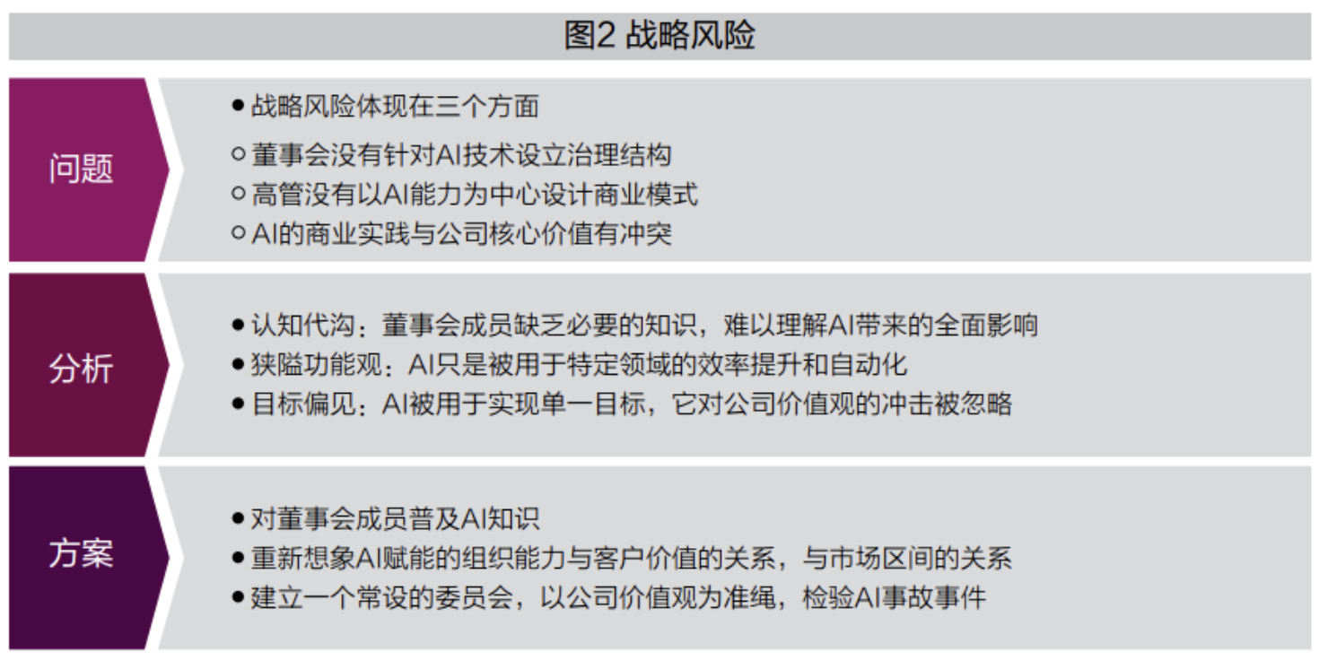 董事会没有在治理结构层面设计和推行有针对性的政策只是AI战略风险的一个表现。另外两个普遍的表现包括企业高管看不到AI改变商业模式,以及引入人工智能初期可能存在的价值冲突。