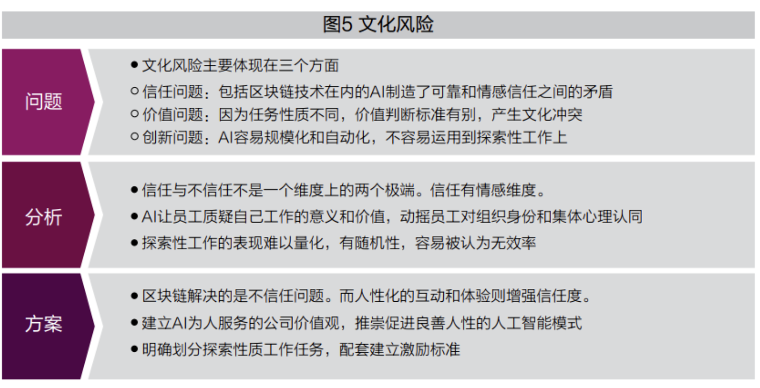 总之,人机共处企业的文化风险主要与社会信任、组织价值和创新战略有关。人工智能对这三方面长期的影响不容忽视。图5概括总结了文化风险的问题和解决方案。