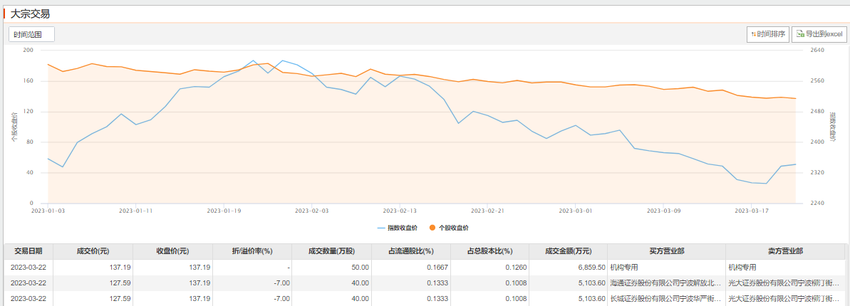 3月22日,锦浪科技3月22日大宗交易平台共发生3笔成交,合计成交量130万股,成交金额1.71亿元。进一步统计,近3个月内该股累计发生21笔大宗交易,合计成交金额为9.42亿元,折价率7%。