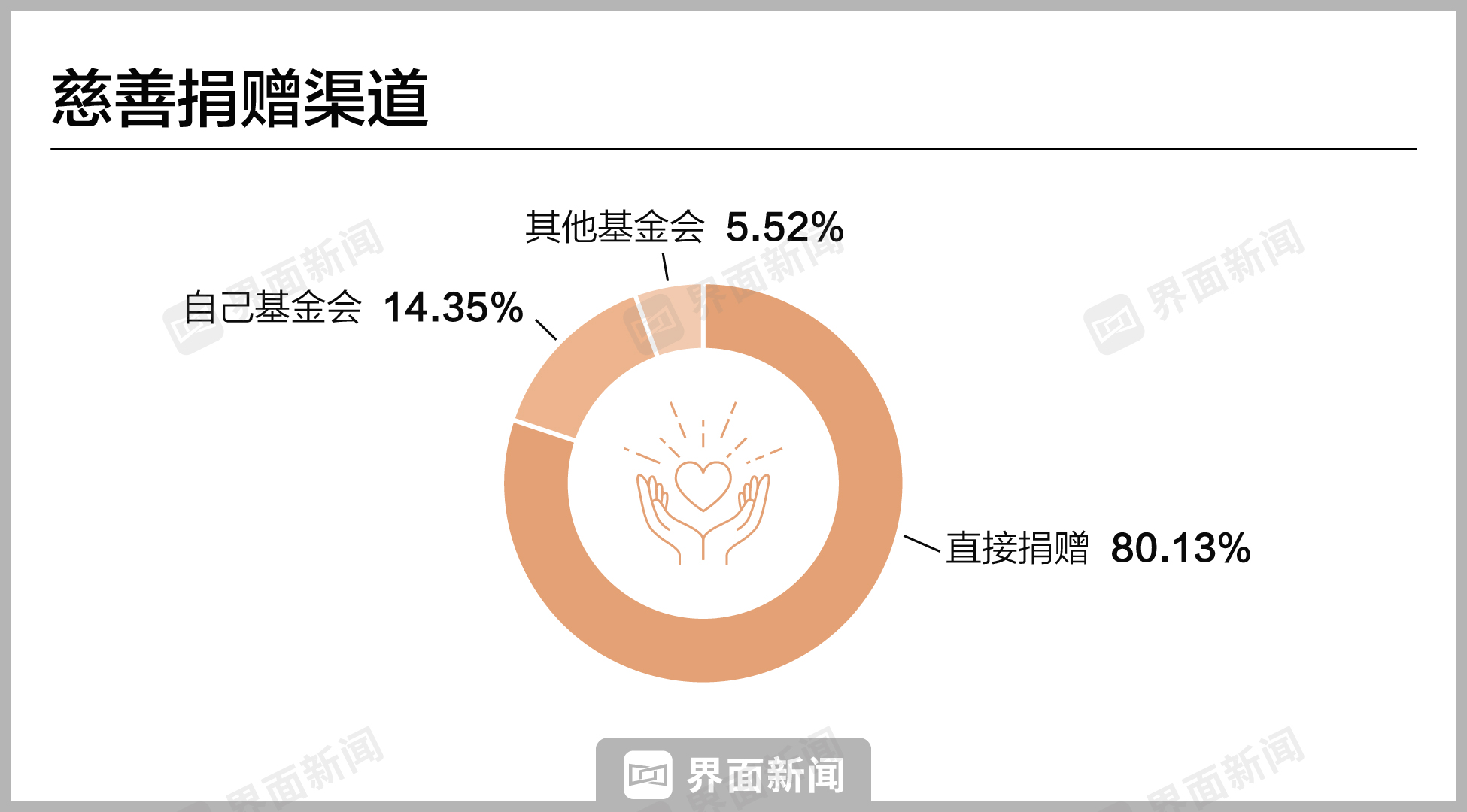 - 从捐赠渠道来看,今年的直接捐赠比例达到80.13%,较去年稍有上升。