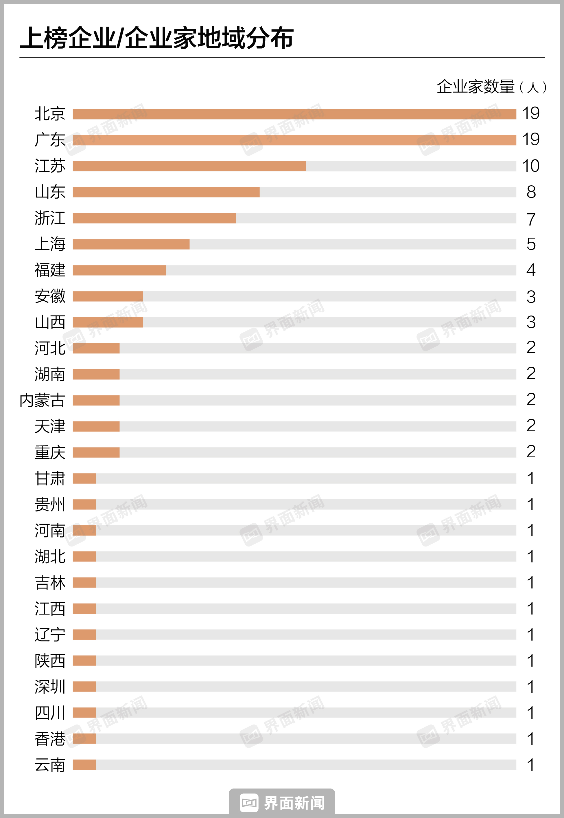从捐赠企业的总部所在地来看,北京的上榜企业家的数量和捐赠总额夺得双第一,19位企业家/企业共捐赠162.03亿元,占榜单捐赠总额的72.12%。广东的企业家素有回馈乡梓的传统,捐赠氛围浓厚,每年的“6·30”扶贫济困日更是一个慈善盛会,今年也有19位企业家上榜,从企业家数量上与北京并列。
