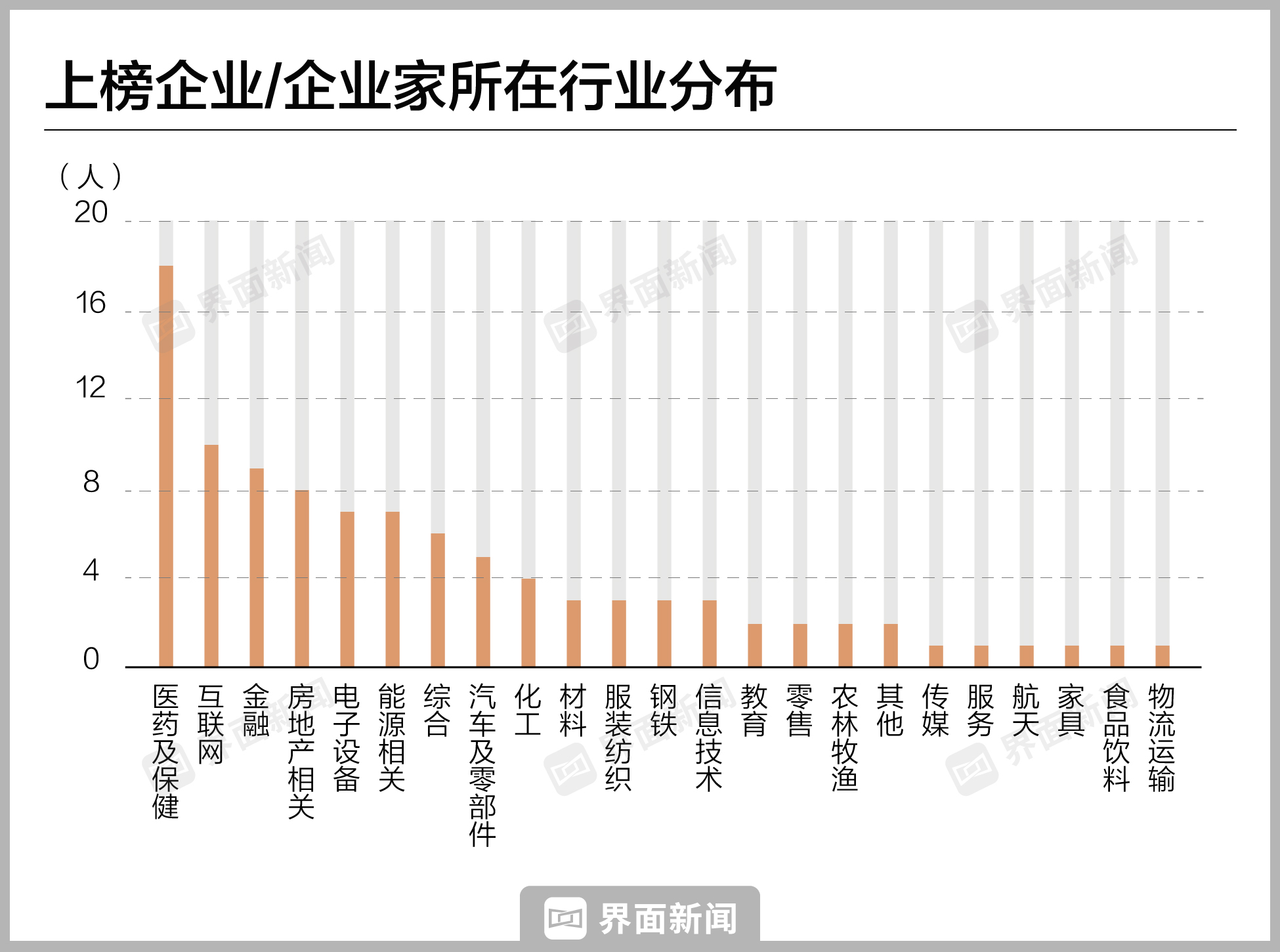 - 从企业/企业家数量上看,医药及保健、金融及互联网是排名前三位的行业。