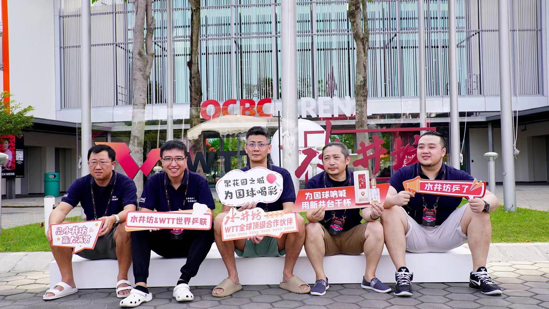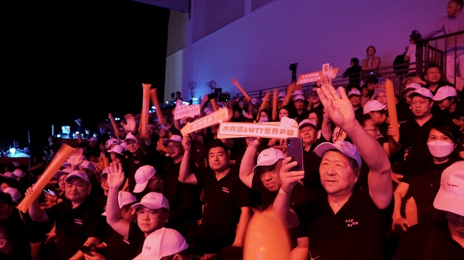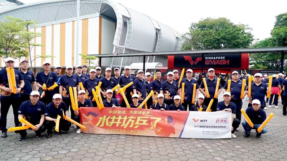 国乒在赛场上出色的表现让国人无比激动的同时,在看台上,也出现了让人激动的一幕。作为WTT世界乒联全球顶级合作伙伴的水井坊此次不远万里从国内组织了近300人的乒乓球爱好者们一起前往新加坡为国乒呐喊助威。