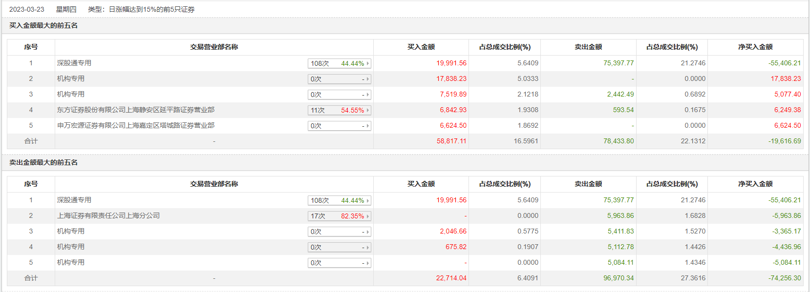 3月23日,同花顺今日涨18.08%,成交额35.44亿元,换手率8.37%,盘后龙虎榜数据显示,深股通专用席位买入2亿元并卖出7.54亿元,2家机构专用席位净买入2.29亿元,3家机构专用席位净卖出1.29亿元。