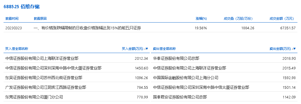 具体来看,中信证券上海联洋证券营业部、中信证券深圳深南中路中信大厦证券营业部分别买入2012.34万元、1450.60万元;华泰证券总部、中信证券上海联洋证券营业部分别卖出2018.90万元、2015.49万元。